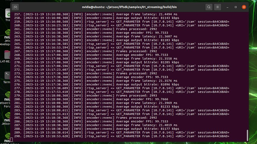 Orin software stack allowed the implementation of an image processing pipeline streaming images from the camera to the computer.
